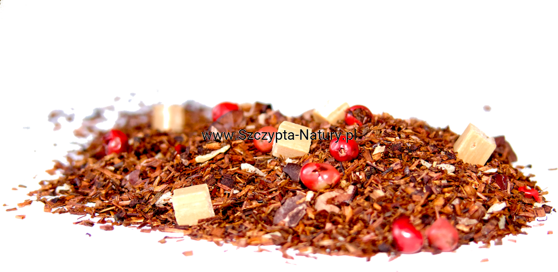 Rooibos, inaczej czerwonokrzew afrykański, to roślina niespokrewniona z tradycyjną herbatą. Jej napar ma bursztynowy kolor i charakterystyczny, łagodny smak. Rooibos nie zawiera kofeiny, dlatego jest polecany dla dzieci, kobiet w ciąży i osób mających problemy z zasypianiem. Łagodzi stres, spowalnia procesy starzenia, działa antybakteryjnie i wpływa korzystnie na układ krwionośny. Napar z czerwonokrzewu jest bogaty w przeciwutleniacze i inne cenne dla zdrowia składniki, takie jak magnez, żelazo, fluor czy kwercetyna. Spróbuj kompozycji czerwonego Rooibosa i Honeybush z dodatkiem kawałków toffi, kokosa i czerwonego pieprzu. Ta wyjątkowa symfonia smaków zachwyci każdego miłośnika słodkości.